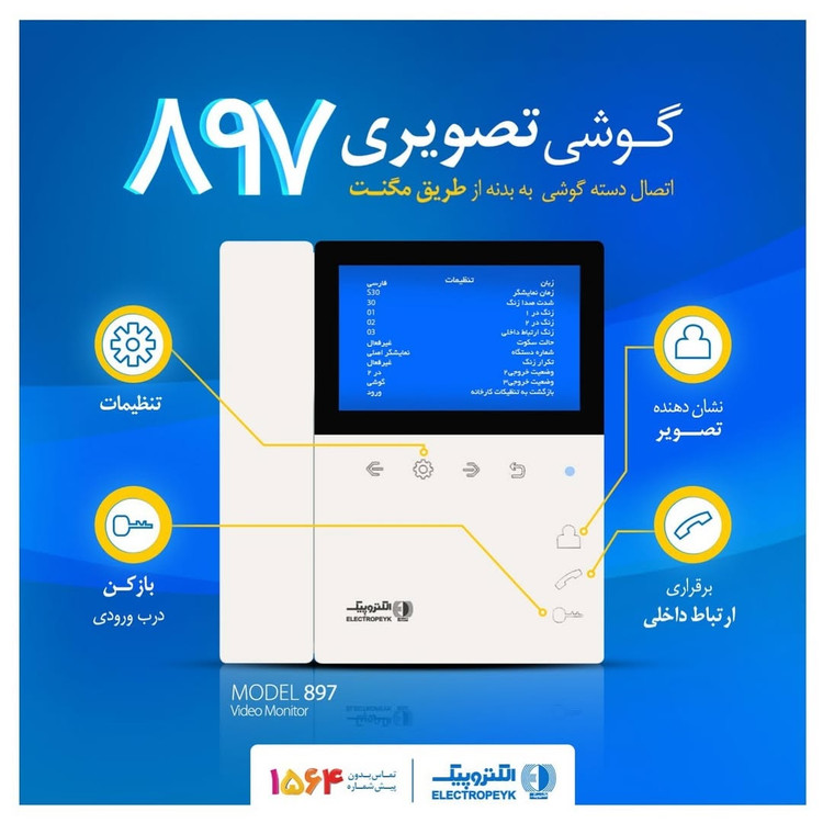 گوشی تصویری ۸۹۷ از جمله محصولاتی است که علاوه بر ظاهری زیبا دارای ویژگیهایی از قبیل، حافظه داخلی و امکان نصب کارت حافظه، امکان پشتیبانی فیلمها با ضبط صدای مراجعهکنندگان ،امکان اتصال به دوربین مداربسته ،امکان تنظیم ملودی و امکان تنظیمات رنگ و روشنایی و درخشش در صفحهنمایش و تنظیمات زمان و تاریخ و قابلیت اتصال به دو پنل دم دری است. رابط گرافیکی محصول از نوع OSD است که در آن کاراکترهای گرافیکی بهصورت نوشتاری بر روی صفحهی نمایش قرار دادهشده است. در تولید بردهای الکترونیکی محصول از فنّاوری SMT با پکیج ۰۶۰۳ استفادهشده است. همچنین فیبر بردهای الکترونیکی از نوع KB۶۱۶۰ است.